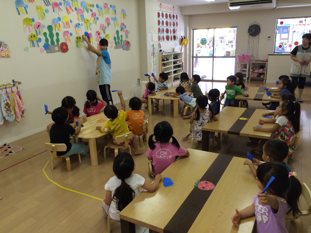 くじら 2015年7月31日 2022年4月27日 日常 今日もとっても暑いので、作品づくりを楽しみました。 お絵かきではなく、折り紙でくじらをつくりました。 尾を折る方向は難しかったみたいですが、そこまではスムーズに折れた子も沢山いました。 目と水しぶきは先生が用意した同じものを貼ったのですが、仕上がりはいろいろな表情になって、面白いですね。
