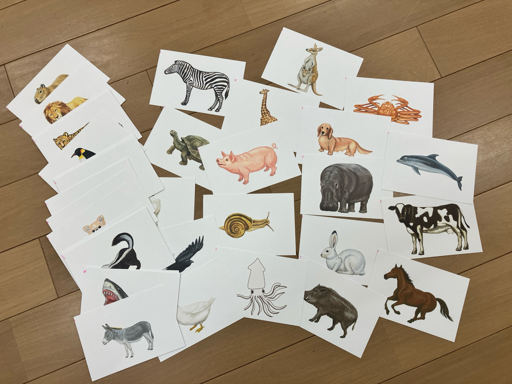 食べ物や動物のカードを見せて、答えられたら