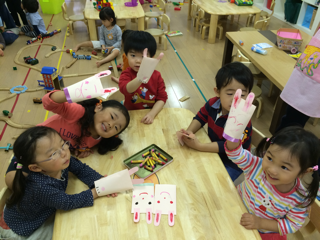 作品づくりでは、封筒に耳をつけて、うさぎのマペットを作りました。