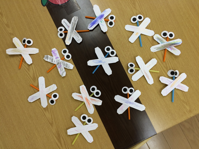 工作といっても、羽に色を塗ってもらい、先生がテープでストローに貼り付けただけなのですが、元からトンボの形になっている羽に色を塗るのではなく、2枚の紙に色を塗ったのが、トンボになっていくという過程を見ることで、驚きや喜びが大きくなります。