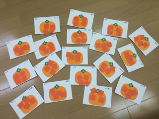 土台は先生が柿を画用紙で作ってくれてあり、みんなには小さな四角い折紙を4枚オレンジの部分に重ねて貼ってもらっただけなのですが、折紙の白い方に糊を塗り、裏返して貼り付けるのは、結構難しい事だと思います。