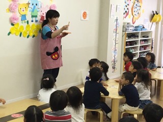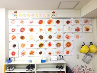 いい感じに描けていたのに、ちょっと目を離したら緑が沢山になりすぎてしまった子や、違う色まで塗り始めてしまった子もいましたが、お皿のマルの中に塗るというのはみんな出来ていました。