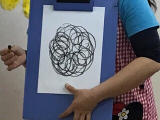 こんな感じでクルクル描きましょうと説明後、先生が用意しておいたお皿の絵の中に、スパゲッティを描きました。