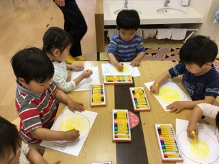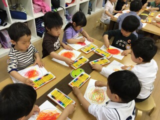 クレヨンの蓋の開け閉めがまだ大変で、パラパラこぼしてしまう子続出でしたが、続けるうちに指先も器用になっていきます。