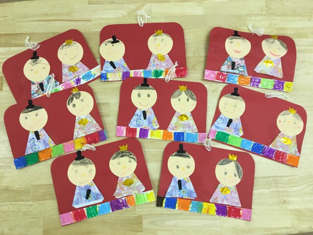 雛飾り 2016年3月7日 2022年4月27日 日常 ご紹介が遅れてしまいましたが完成した雛飾りがこちら。 顔を書き、折り紙で着物を折り、すべてのパーツを糊付けしました。 お顔を書くのが上手になりましたよね。 ちゃんと説明を聞かないと難しいのですが、今まで手伝わないと完成できなかった子が、自力でこれだけ工程のあるものを完成させる姿に感激しました。