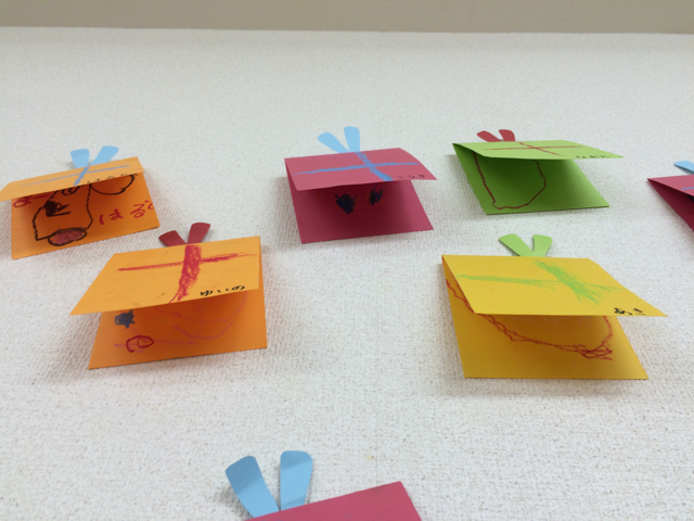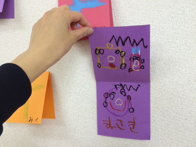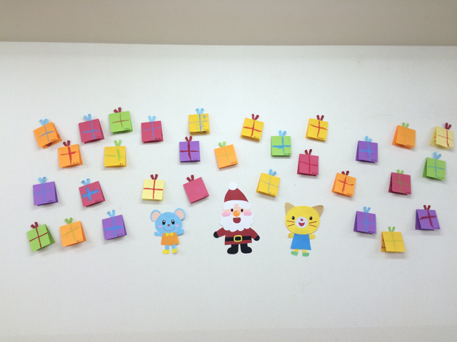 12月の壁飾り 2015年12月10日 2022年4月27日 日常 12月といえばクリスマス。 サンタさんへのメッセージ(リクエスト?)カードを作りました。 下から覗き込むとこんな感じ。 貼り付けたリボンの結び目と同じ色のクレヨンで、十字を書くというのを、みんなが理解していました。 プレゼントのお願いを絵や字で思い思いに書いてあります。