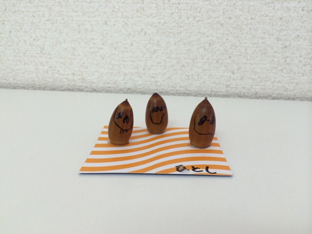 どんぐり 2014年9月26日 2022年4月27日 お知らせ 先日拾ったどんぐりに顔を書きました。 どんぐりは小さいし、丸みもあるので難しかったです。 でもボンドで台紙に立たせるのは上手にできました。