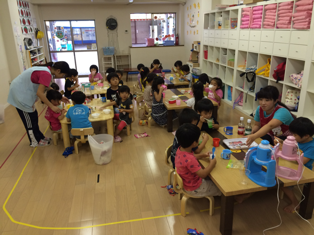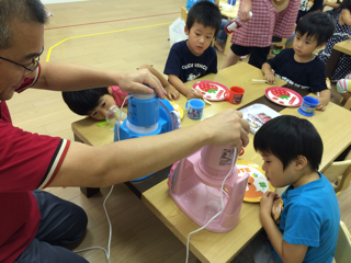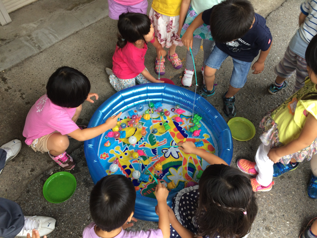 延長保育でのお楽しみイベントとして「かき氷」と「魚釣り大会」を行いました。