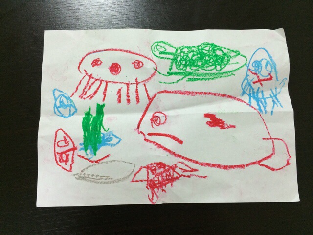 急遽決まったお絵描きですが、さすがベテランの先生なので、手遊び歌でお魚になってみたり、クイズで海の中の生き物を子供達に聞いてみたりと、イメージを膨らませてから絵を描いたので、みんなノリノリで「波」「タコ」「イカ」「ウミガメ」「わかめ」と自分で書いているものを教えてくれました。
