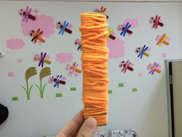 秋の壁飾り2 2014年9月10日 2022年4月27日 日常 ぶどうに続き、秋の壁飾りです。 ダンボールの芯に毛糸を巻きつけてトンボの胴体を作りました。 ぐるぐるするのにじっくり時間がかかった子もいましたが、今までとは違う作業で楽しかったみたいです。 目は眉毛やまつ毛を書いた子もいて、ユーモラスなトンボが沢山飛びました。